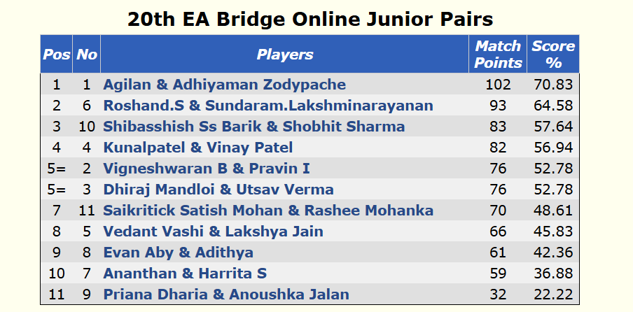 EA BRIDGE ONLINE JUNIOR PAIRS- 5th APRIL