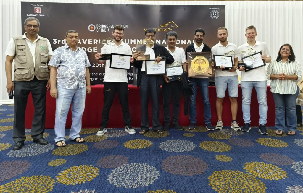 in the Mavericks Gold Team Event, Total 28 teams participated in this event. After 8 rounds of Swiss League held on 11th and 12th Dec, top 8 teams made it to the Quarter Finals. Quarter-Final, Semi Final matches were of 48 Boards (12 x 4) and were held on 13th to 14th June. The play-off for3 rd place was of 24 Boards and Final was of 72 Boards (12×6).